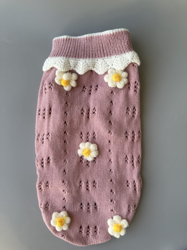 Un maglioncino romantico e delicato, realizzato in una morbida maglia traforata e impreziosito da margherite crochet.